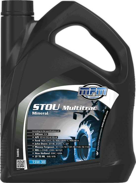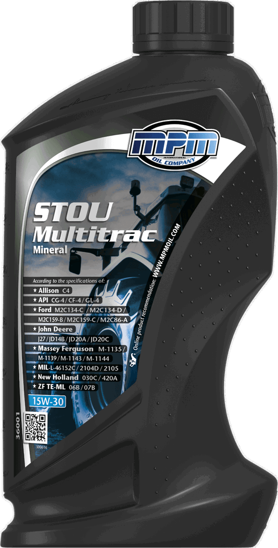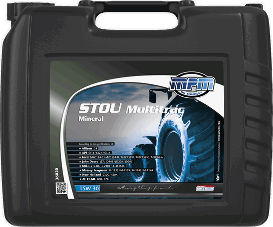 This mineral STOU (Super Tractor Oil Universal) multitrac SAE 15W-30 multifunctional agricultural oil has been specially developed for use in diesel engines, transmissions, power take-offs, wet brakes, hydraulic systems, power steering and end drive of among others tractors, combines, road and hydraulic engineering machines.